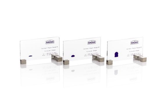 Die Sets CP21 und CP22 enthalten jeweils Standards mit Konturen exakt kreisbogenförmiger Tropfen für die Kalibrierung der Höhe-Breite-Methode und der Kreismethode zur Messung des Kontaktwinkels. Die Konturen mit Kontaktwinkeln von 30°, 60° und 120° weichen weniger als 0,1° vom Sollwert ab. Das Set CP22 enthält zusätzlich ein Zertifikat, welches die hohe Genauigkeit des Aufdrucks ausweist.