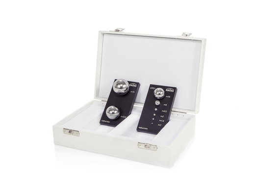 Das Kalibrierset CP31 besteht aus Edelstahlkugeln mit genau definierten Radien und einer entsprechend exakten Oberflächenkrümmung. Die Kugeln dienen als Modelle für kugelförmig gekrümmte Tropfenoberflächen, um die Zuverlässigkeit der optischen Kontaktwinkelmessung mit der Aufsichtdistanzmethode zu überprüfen. Mit den 8 Kugeln des Sets wird der gesamte Messbereich des TVA100 in engen Abständen abgedeckt.