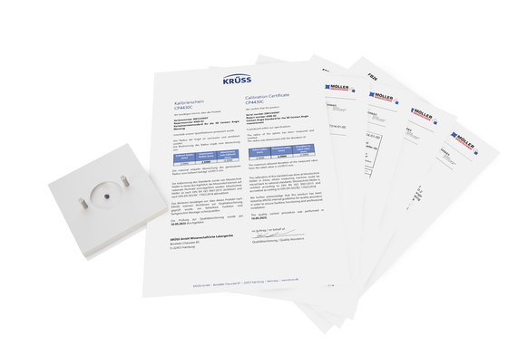 Dokumentieren Sie die Messgenauigkeit Ihres Ayríís anhand zuverlässiger Kalibriermessungen mit dem Kalibrierset CP4430C. Das Set enthält einen kugelförmigen Kontaktwinkelstandard mit präzise definiertem Kugelradius, einen Ständer zur korrekten Platzierung des Ayríís sowie ein Zertifikat, das die Genauigkeit des Standards bescheinigt. Die exakte Oberflächenkrümmung der Kugel simuliert einen perfekt runden Tropfen mit einem definierten, virtuellen Kontaktwinkel. Anhand des Ergebnisses für den Radius wird die Messwertabweichung ermittelt.
