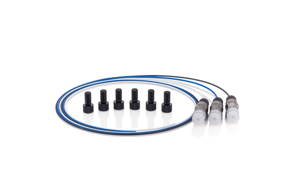 The two sets with tubes for multi dosing units each contain two suitably tailored tubes made of chemically resistant PTFE in each of three colors. We have already fitted the tubes for the dosing needle with needle heads, which are simply clicked into the rotating carrier of the dosing unit. Two fittings for liquid-tight connection to the dosing valves are supplied for each tube color. The different tube colors enable the dosing lines to be quickly associated with the syringes and appropriate test liquids.