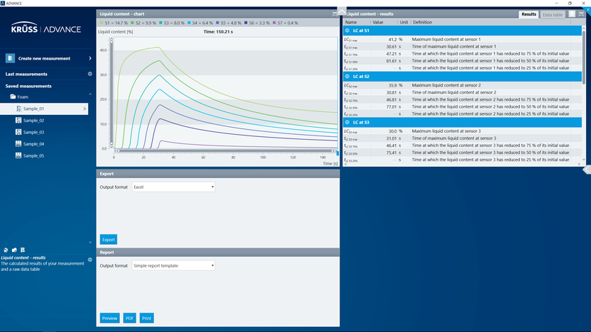 Measure foamability and foam stability at standard conditions or even under high temperature and pressure. Use ADVANCE as the only available software for automated measurements according to Ross-Miles. Or even gather even deeper knowledge about your foam with time-dependent measurements of its liquid content and bubble structure.