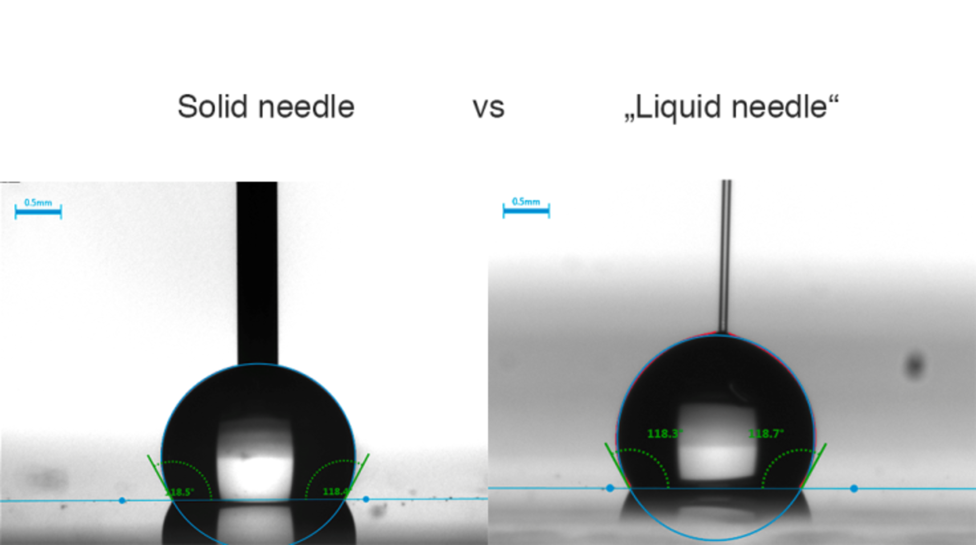 Needle-deposition of sessile drops is a well-established method in contact angle analysis. However, customers regularly report user-dependent variations of contact angles as well as problems to deposit liquid drops on super-hydrophobic surfaces, or they demand higher deposition speeds. Here we present a new technique for drop deposition that is based on a Liquid Needle in contrast to a solid one. Further, we highlight the main findings of a scientific study published in the Journal of Colloid and Polymer Science (DOI 10.1007/s00396-015-3823-1) [1] where we thoroughly compared both techniques using 14 different sample surfaces. We show that the resulting contact angles of droplets dosed by either technique are identical. In addition, we explain how potential pitfalls of needle-dosing – when not carried out very carefully – are eliminated by the alternative Liquid Needle dosing technique.