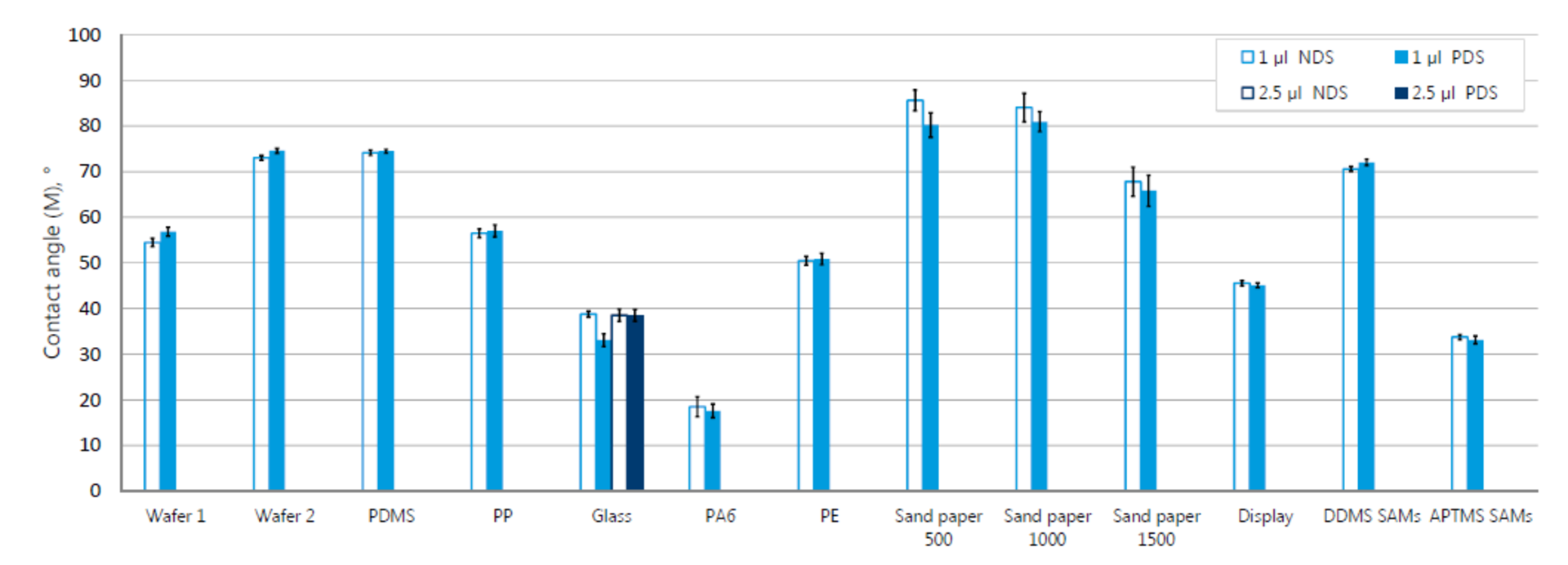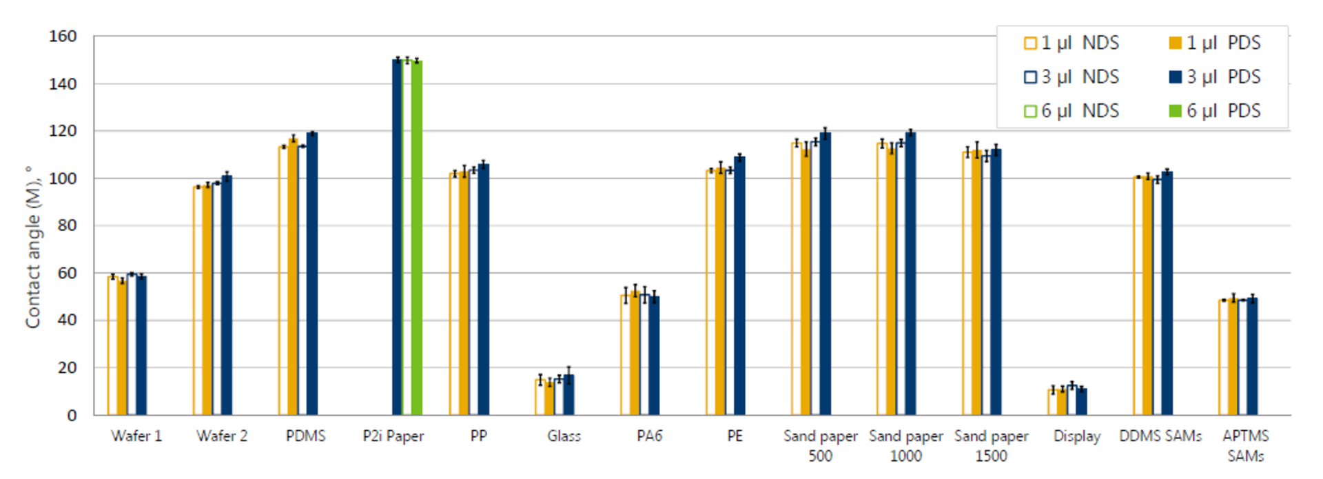 On super-hydrophobic surfaces like the P2i paper, it was not possible to transfer drops of volumes as small as 3 µL to the surface with the NDS. This is due to the very low surface free energy (very low adhesive interactions) of this sample. Therefore drops of 6 µL had to be used for NDS (Fig. 3a, green bar). In contrast, drops of virtually any volume can be dosed on such samples with the PDS. This is something we consider a strong point of the PDS.