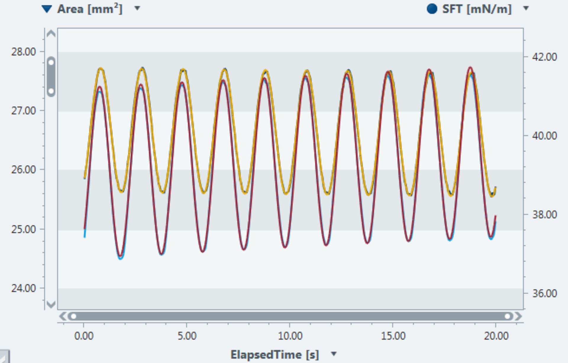 Equilibrium SFT values of 37.8, 35.5 and 53.4 mN/m were determined for samples 1, 2 and 3. A graph comprising surface and SFT data during oscillation is shown by way of example for sample 1 in Fig. 2. The ADVANCE software permits direct review of the raw data (blue), by graphically mapping the adjusted sine functions of the area (yellow) and SFT (red) in parallel. In the example shown, the recorded data is fully described by the adjusted sine functions, so the raw data curves are hard to identify under the congruent sine graphs.