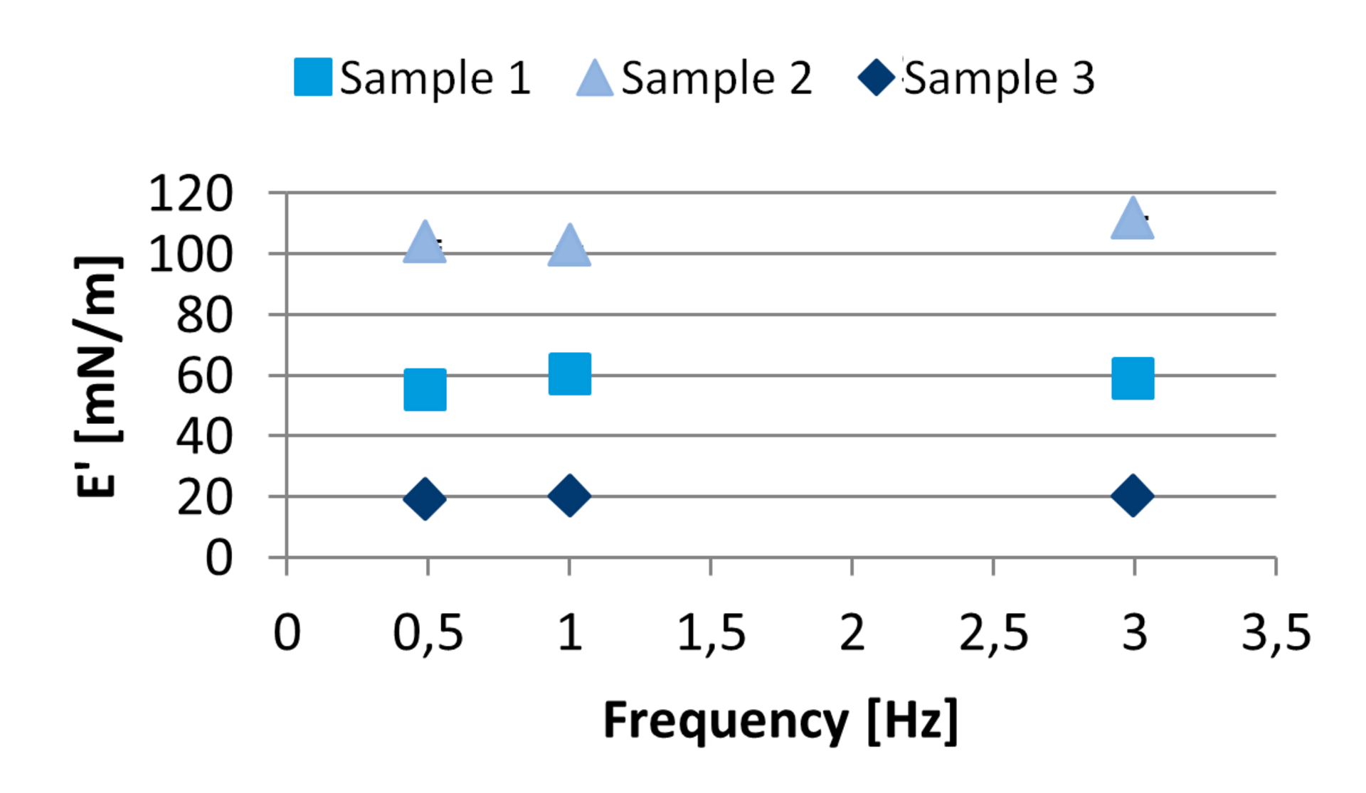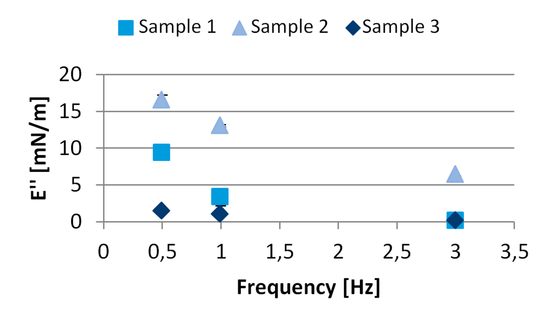 In all three samples, the elastic component dominates the interfacial rheological behavior (E’>>E’’). While none of the samples in the frequency range examined show any change in the elastic modulus, they differ from one another quite clearly, whereby sample 2 with approximately 100 mN/m has the highest value and sample 3 with approximately 20 mN/m has the lowest value. E’’ declines for all three samples as the frequency increases.