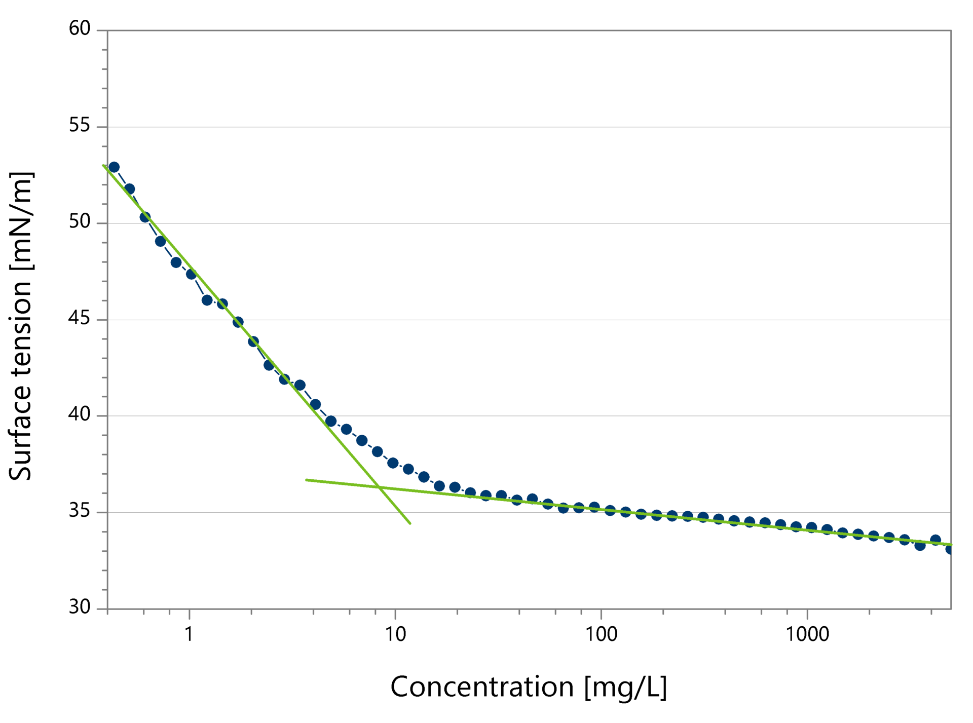 For the determination of the critical micelle concentration (CMC) in reverse mode (measurement at decreasing concentration) we have measured the surface tension (SFT) of aqueous solutions of PG-10-1-O. The determination was performed fully automatically with a Force Tensiometer - K100 equipped with two Micro Dispensers for dilution between measurements. A total of 90 PG-10-1-O concentrations were measured at a temperature of 25 ±1 °C by successive dilution of the concentrated starting solution.