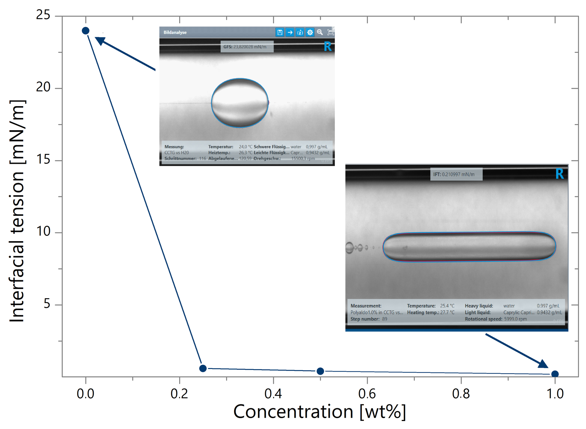 We determined the interfacial tension (IFT) of these solutions as well as of pure CCTG versus water with the Spinning Drop Tensiometer – SDT at room temperature (24±1 °C). The IFT resulted from an optical Young-Laplace analysis of the curvature of a droplet rotating in a capillary between 6,000 and 15,000 rpm. We also determined the densities of the solutions required as initial parameters for spinning drop measurements using the Force Tensiometer – K100.