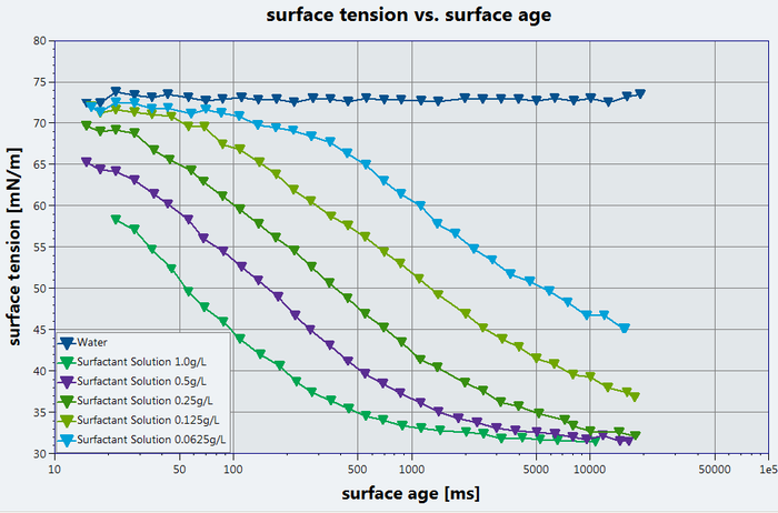 The measured value corresponds to the surface tension at a certain surface age, the time from the start of the bubble formation to the occurrence of the pressure maximum. The dependence of surface tension on surface age can be measured by varying the speed at which bubbles are produced.