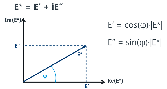 When displaying the moduli E*, E' and E'' in the complex number plane it becomes clear from the real part Re and the imaginary part Im that E' and E'' result from trigonometric functions.
