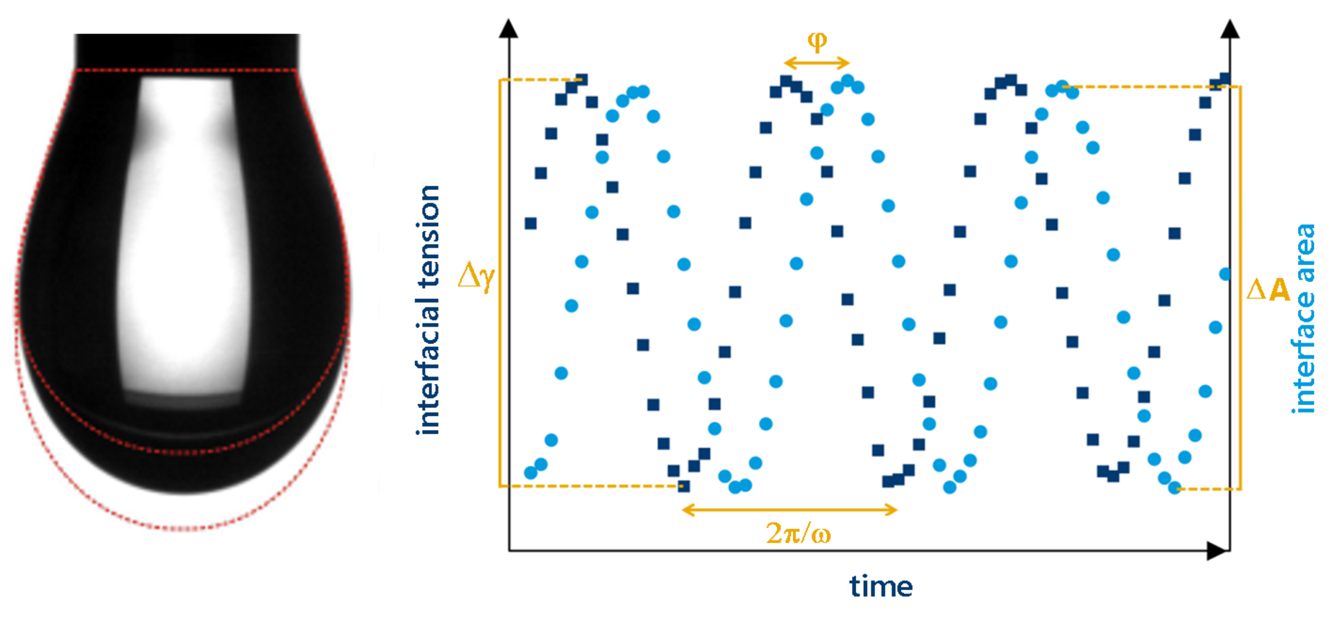 During the measurement, the interface area of a pendant drop or a gas bubble, which is recorded with a camera, is changed periodically and exactly sinusidoidally by means of a dosing drive that operates with extreme precision. In doing this, the SFT/IFT is measured using drop shape analysis with a Young-Laplace fit to obtain its dependency from surface area A and time t. Due to the underlying sine function, the angle φ (see figure above) corresponds to the phase shift between the change in surface area and the SFT/IFT, which also displays a sine-curve progression.