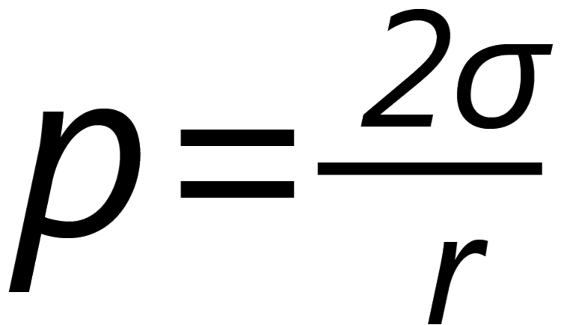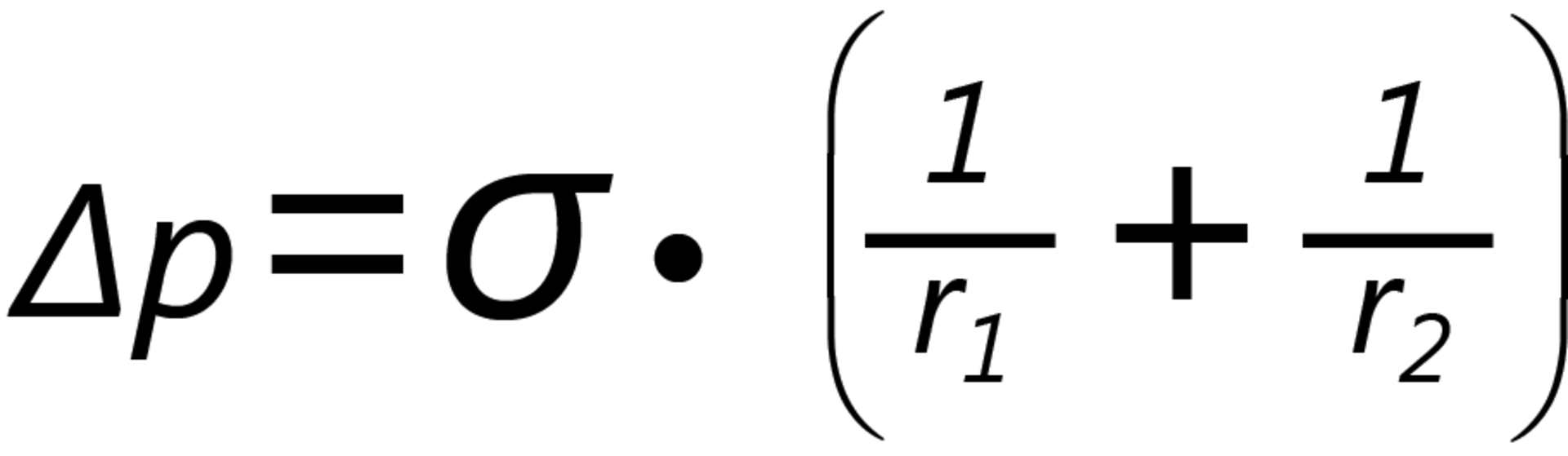 According to the Young-Laplace equation, this pressure p depends on the surface tension σ and the radius of curvature r (for a sphere) or the main radii of curvature r1 and r2 (for a surface with any curvature):