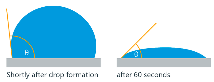 With real solids, liquids and ambient conditions, the contact angle can vary as a function of time and location. Inhomogeneities and changes of wetting over time can therefore be detected by means of the static contact angle.