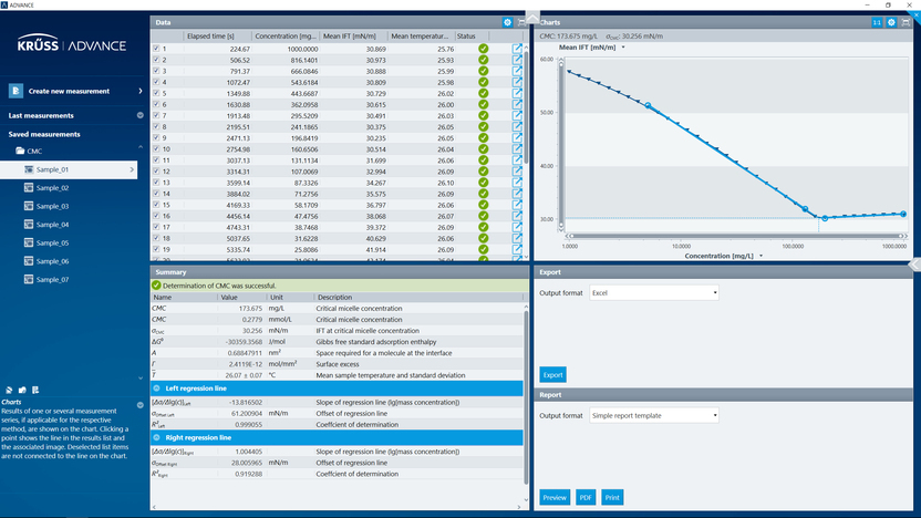 To carry out all these tasks easily and reproducibly, ADVANCE incorporates manifold motorized components, precise sensors, and cameras in automated measurements. This includes tasks as complex as determinations of the critical micelle concentration (CMC) with automatically generated concentration series.
